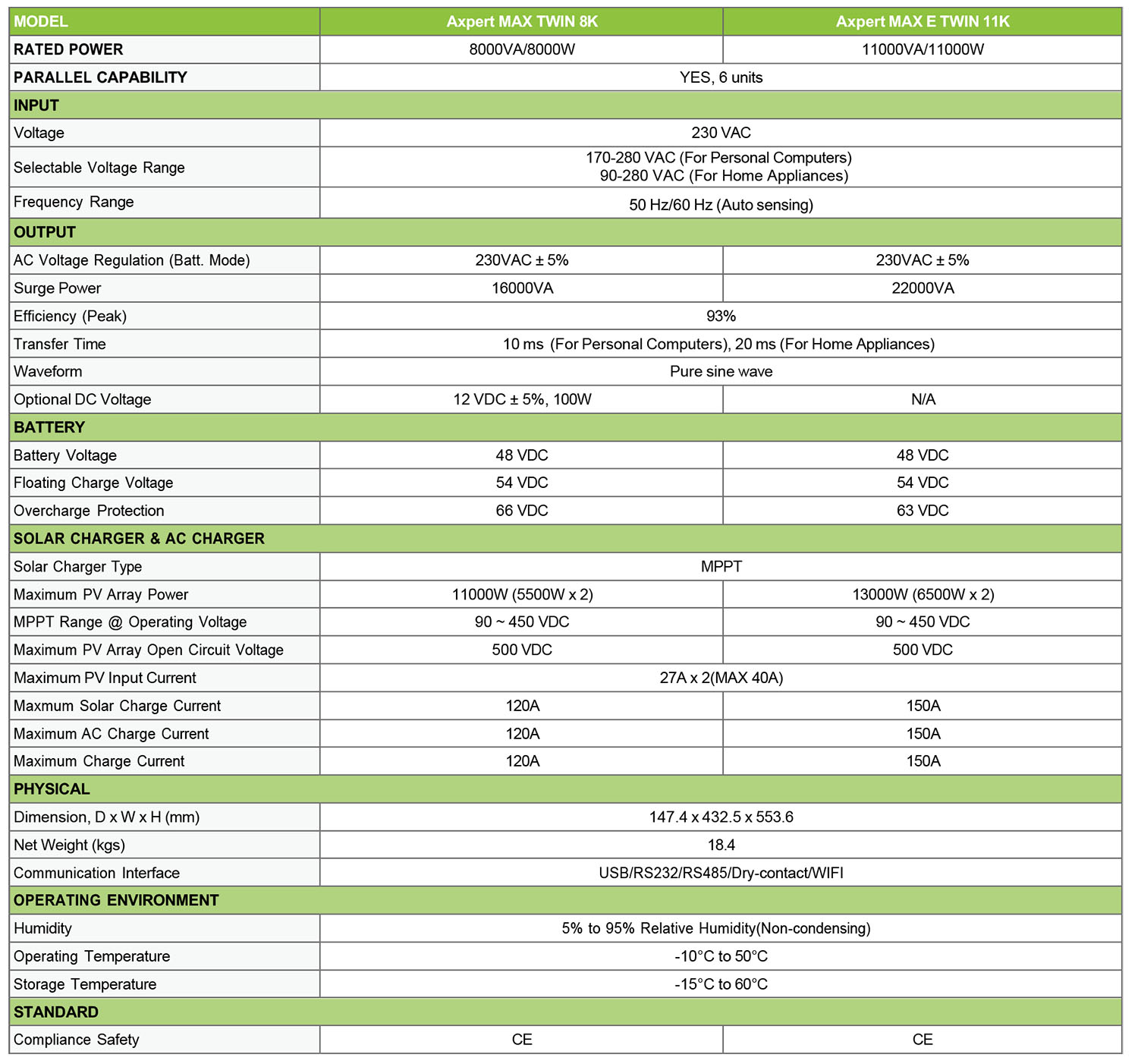 Axpert MAX TWIN is a high-performance off-grid inverter with 120A /150A MPPT solar charger and customizable status LED bar with RGB lights. Axpert MAX TWIN is occupied with two outputs. The second output can be scheduled on/off, setting cut-off voltage or SOC and discharging time via LCD setting.